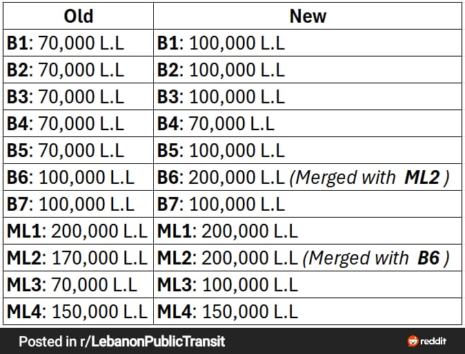 صورة لجدول الاسعار القديمة والجديدة لل ١١ خط حسب مشاركتها على رابطة الركاب