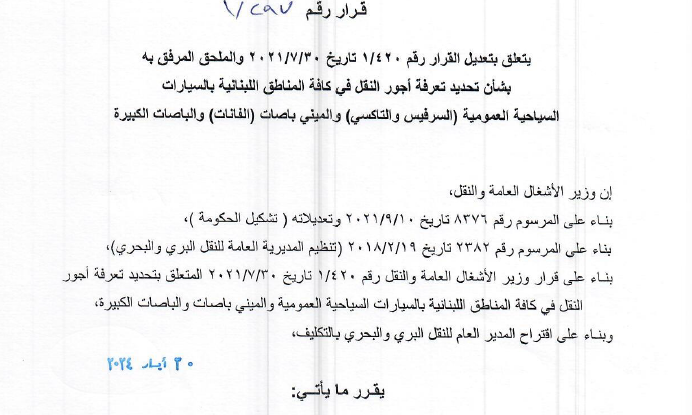 الا ان هذا التعديل لم يكن حسب الاصول القانونية فتعديل الاسعار بحاجة لقرار من وزير النقل واخر تعديل اسعار حصل في تاريخ 20 ايار